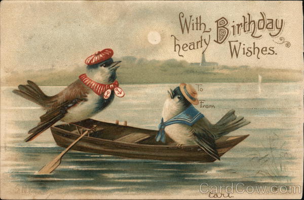 With Hearty Birthday Wishes - Bird Couple in Rowboat Birds Here is a picture example I rowboat